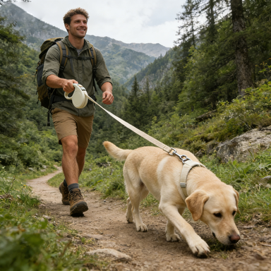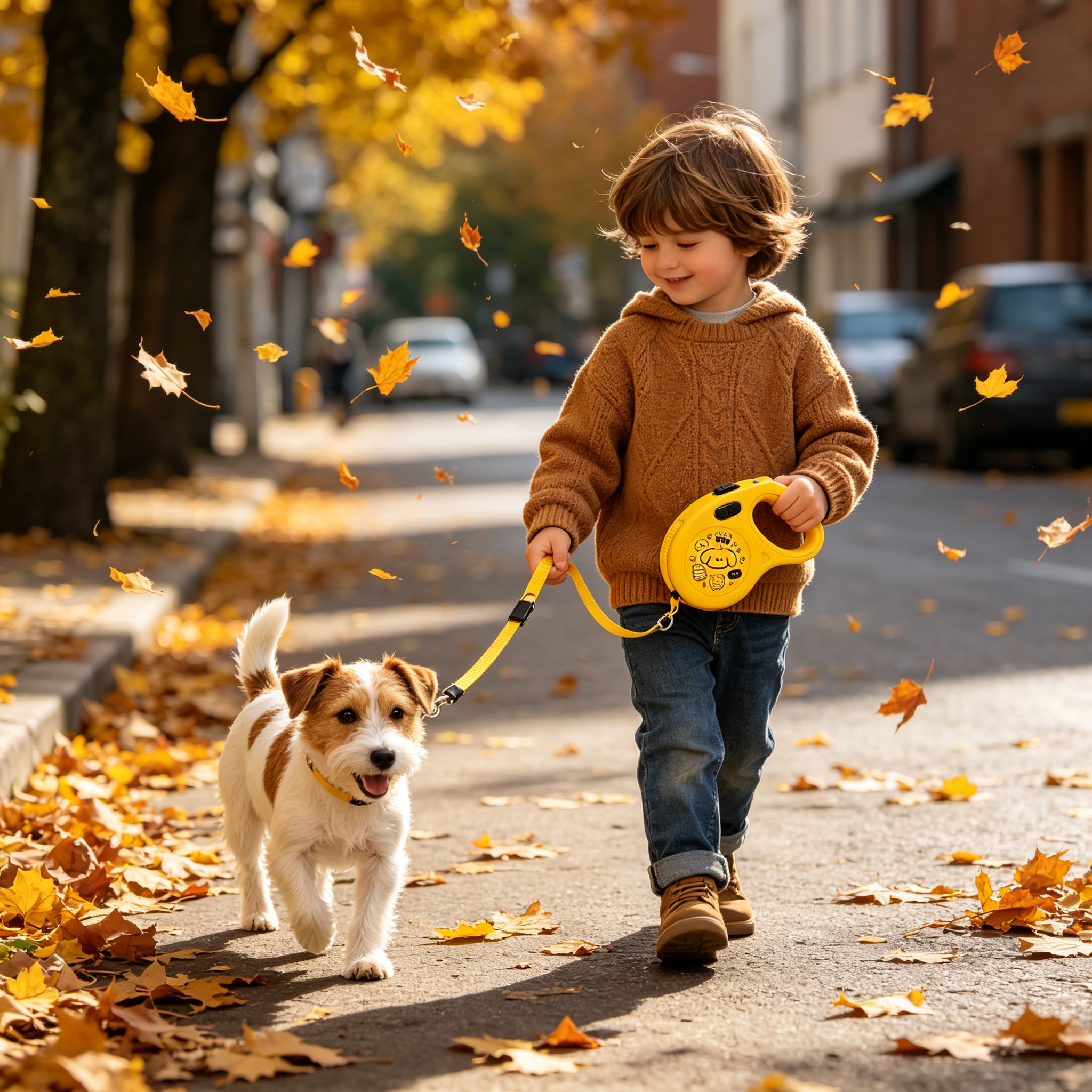 Bright yellow retractable leash featuring adorable cartoon dog illustrations, a smooth locking mechanism, and a padded handle for extended use.