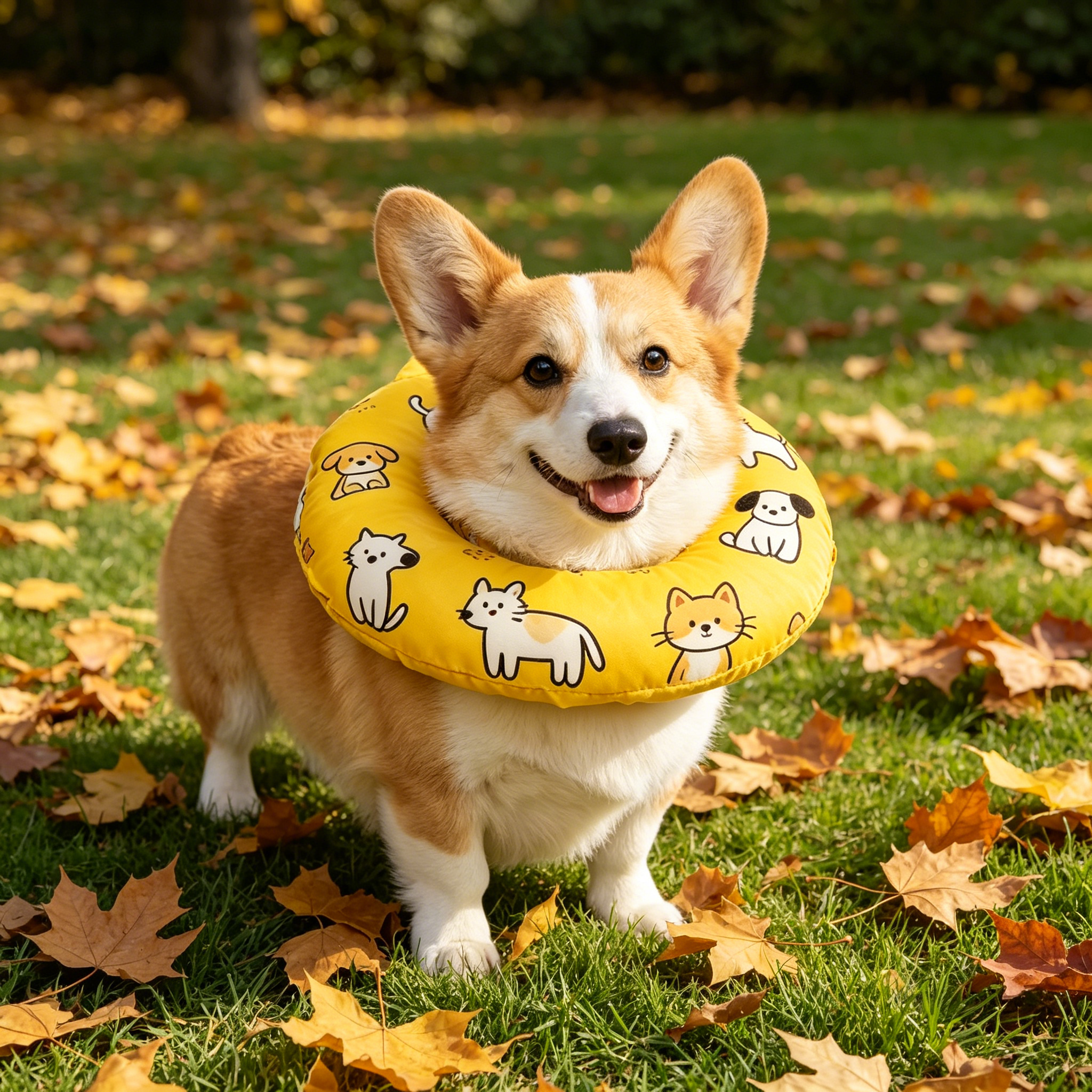 Vibrant yellow collar with cat ears and playful dog & cat design, soft material for pet comfort
